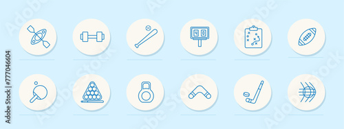 Sports set icon. American football, stand, scoreboard, plan, baseball, boomerang, hockey, kettlebell, blue, active recreation, healthy lifestyle. Sports disciplines concept. Vector line icon.