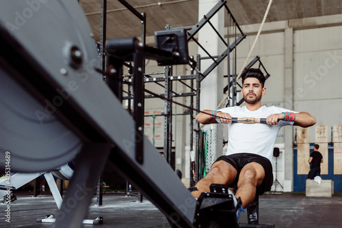 Sportsman exercising with rowing machine at gym
