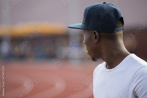 Sportsman in a cap on stadium, african male workout outside