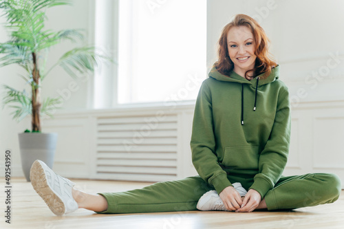 Sporty motivated female demonstrates nice flexibility, slim body, stretches legs, has fitness pilates exercises, wears green tracksuit, white sneakes, sits on floor, prefers healthy lifestyle.