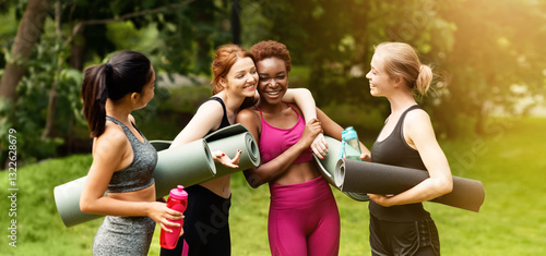 Sporty multiracial ladies talking to each other after yoga practice outside, panorama