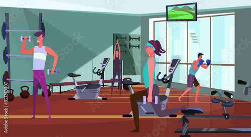 Sporty people exercising in gym. Men and women lifting dumbbells, lunging flat vector illustration. Fitness, equipment, training body concept for banner, website design or landing web page
