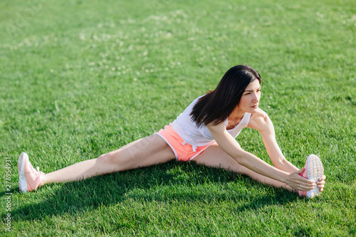 Sporty woman brunette runner in sport wear doing workout sessions on the field in a sports suit in the summer on a hot sunny day. Sport and healthy lifestyle