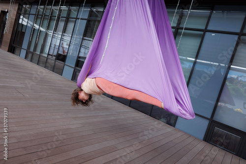 Sporty woman doing aero yoga in hammock. Brunette girl in sportswear exercising aerial yoga on terrace. Windows in background