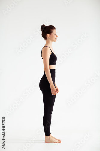 Sporty yoga girl on white background stretching in pose Adho Mukha Svanasana, downward-facing dog Pose, downward dog, down dog. Concept of healthy life and natural balance. Full length