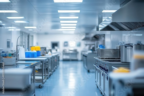 Spotless, sterile kitchen with bright lighting, showcasing high food safety standards