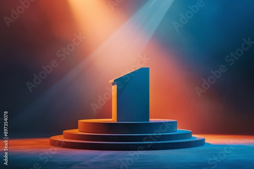 Spotlight on a single pedestal highlighting a winner's podium staged in a dramatic lighting setup with vibrant colors