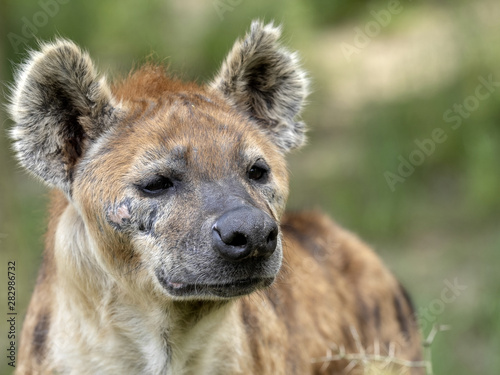 Spotted hyena, Crocuta crocuta, curiously observes photographer