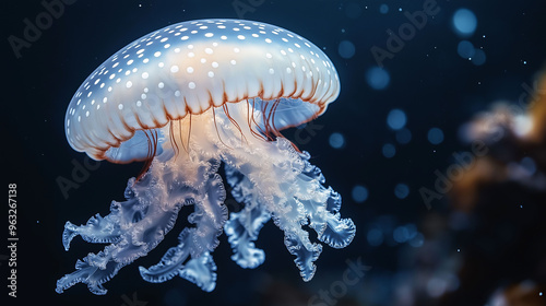 Spotted Jellyfish with Tentacles in Dark Blue Water