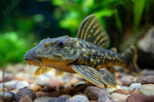 Spotted Pleco Fish Swimming in Aquarium with Rocks and Greenery