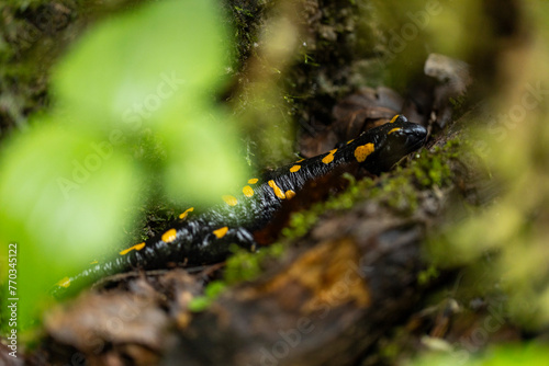 Spotted salamander, black skin color with yellow spots, shiny skin, venomous creatures. In their natural habitat, wild nature. exploring, into the wild.watercourse and lush vegetation.