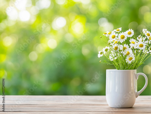 Spring - Chamomile Flowers In Teacup On Wooden Table In Garden