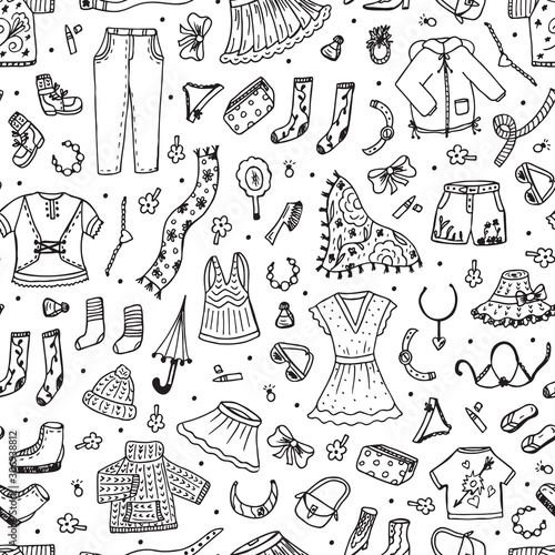 Spring and summer fashion clothes seamless pattern. Hand drawn doodle women clothing Vector background