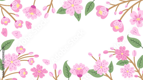 Spring Background with Cherry Blossom. Springtime 1920x1080 ratio frame with pink sakura flowers branches twigs petals leaf. Japanese Hanami template. Vector illustration