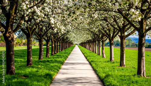Spring blooming trees with an empty walking path in the middle, the path goes into the distance
