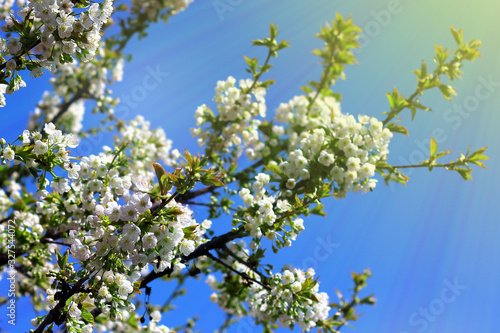 Spring blossom natural background. Cherry tree in white flowers. Blossoming cherry tree branch.