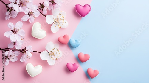 Spring blossoms and pastel hearts on pink and blue background