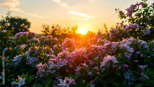 Spring Blossoms in a Sunset Garden: Nature's Beauty