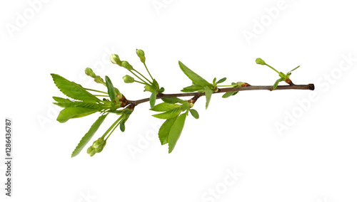 Spring buds and small leaves on twig of cherry tree isolated on white or transarent background