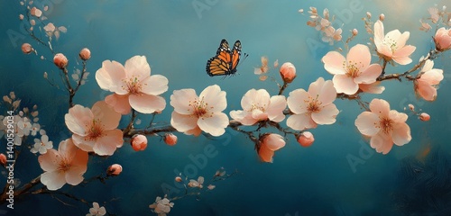 Spring Cherry Blossoms and Butterflies Under Blue Sky in Nature Outdoors