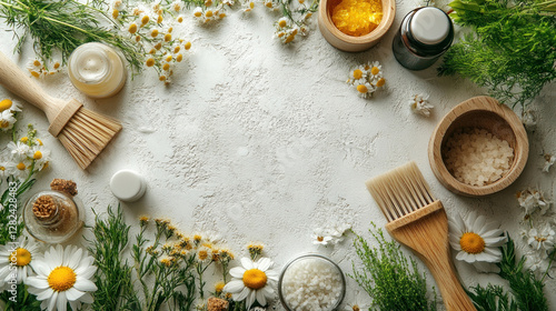 Spring cleaning flat lay featuring eco-friendly tools and fresh flowers on a clean, white surface