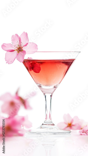 Spring cocktail with pink cherry blossom garnish in a clear glass isolated on a white background, vertical image.