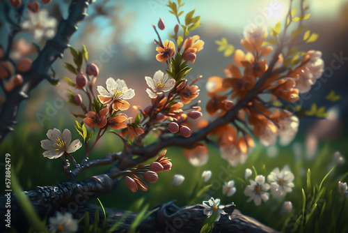 Spring concept background, close up of spring flowers in garden or meadow, generative ai