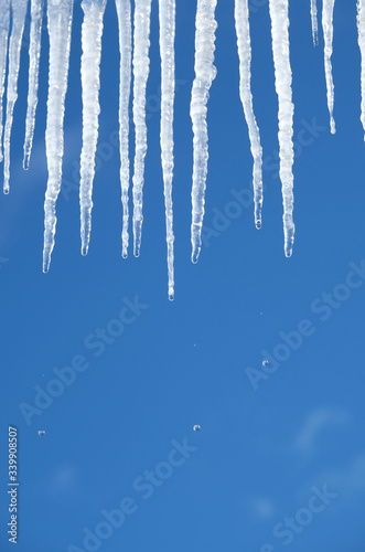 Spring drops falls down from long crystal melting icicles hanging down before clear blue sky on bright sunny thaw day vertical view close up