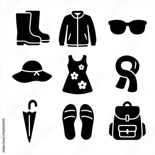 Spring Fashion Icons. Solid, filled icon set of Spring fashion: rain boots, light jacket, sunglasses, sunhat, floral dress, scarf,