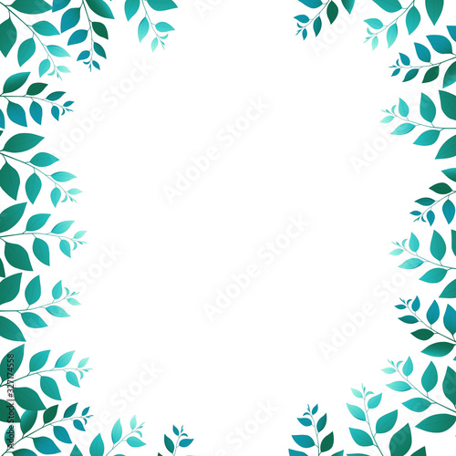 Spring floral frame with green sprigs on white background. Trend color illustration with branches. Template design for invitation, poster, card. Holiday card or congratulation.
