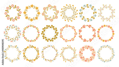 Spring flower circle frame big set. Floral circle frame. Hand drawn botanical round border, laurel, wreath with branches, leaves and flowers illustration for wedding invitation, card, logo