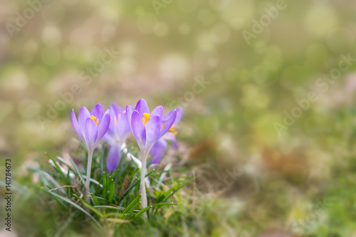 Spring flowering. Purple crocus flowers in the park. Slovakia