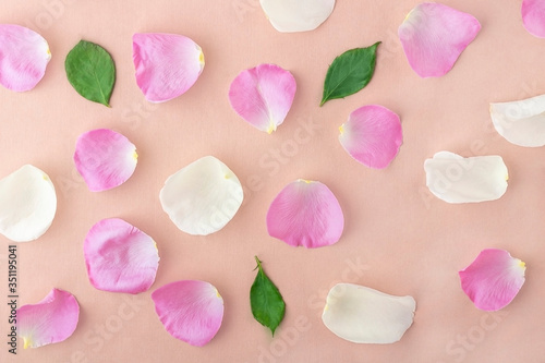 Spring flowers composition. Creative pattern of pastel rose flower petals. Romantic background. Valentines, womens, mothers day or wedding concept. Flat lay, top view, copy space