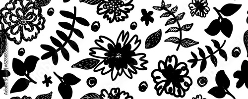 Spring flowers hand drawn vector seamless pattern. Black brush flower silhouettes. Roses, peonies and chrysanthemums black silhouettes. Floral drawings with texture. Summer botanical background