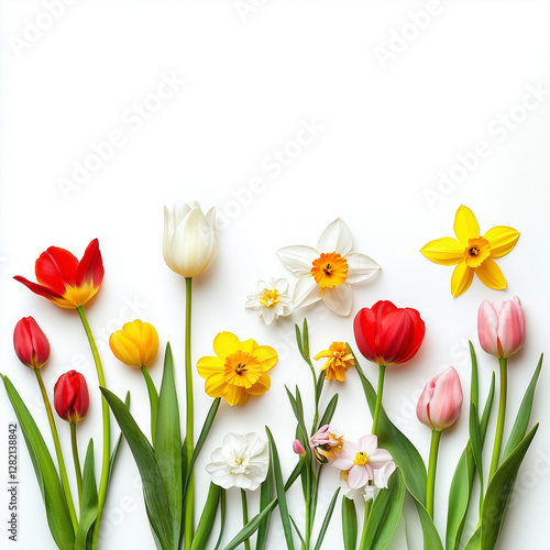 Spring flowers (tulips, daffodils, lilies) on a white background