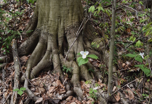 Spring forest scene of a white trillium emerging from American beech roots.