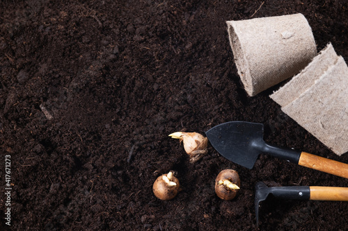 Spring gardening background. Gardening tools, flower pots and crocus bulbs on fertile soil texture background.