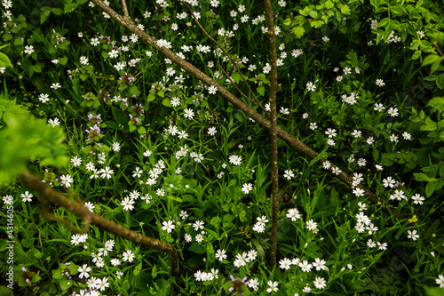 Spring green forest. Lots of young trees casting shadows, Sunrise in a beautiful forest in Moldova,Europe. Beautiful green Landscape. Nature.