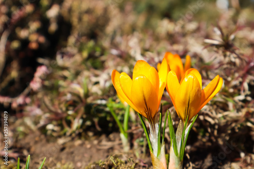 Spring is coming. The first yellow crocuses in my garden on a sunny day