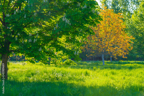 Spring is in the air with the lush green foliage of trees in a green pasture in sunlight at sunrise in a spring morning