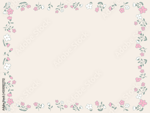 Spring light soft muted background. Frame of flowers, floral plants, leaves. Elegant aesthetic stylish beautiful romantic flower pattern. Hand drawing doodles of botanical elements. Space for text