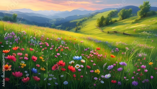 Spring Meadow with Wildflowers, Rustic Fence, and Sunrise Over Snow-Capped Mountains