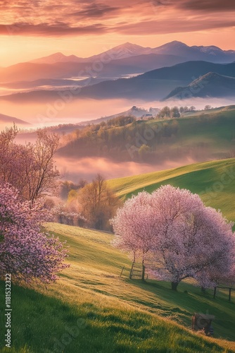Spring mountains and forest and fog. Beautiful nature.