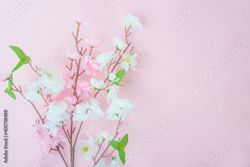 Spring or easter greeting card. Twigs of white and pink flowers on pink background. Space for text
