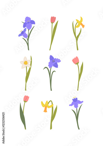 Spring poster with various flowers. Daffodil, iris and tulip flowers. Vector floral flat colorful illustration
