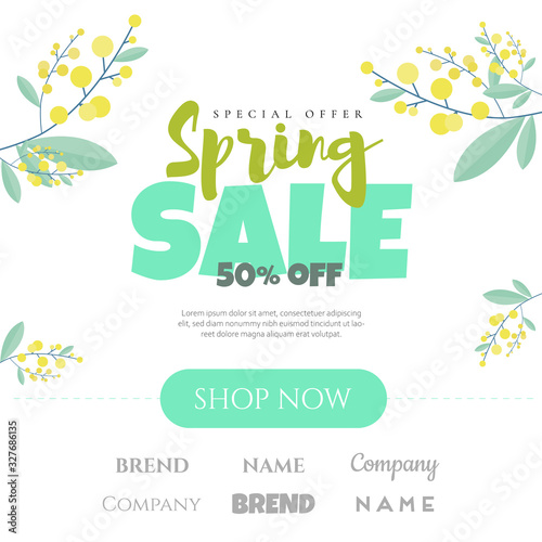 Spring sale banner with yellow flowers on a white background for promotions, website, advertising. Vector illustration template.