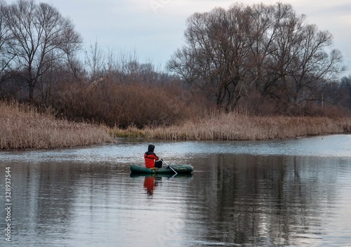 Spring scenery with a fisherman who fishes in an inflatable boat on the river, along the banks of which trees and dry reeds grow