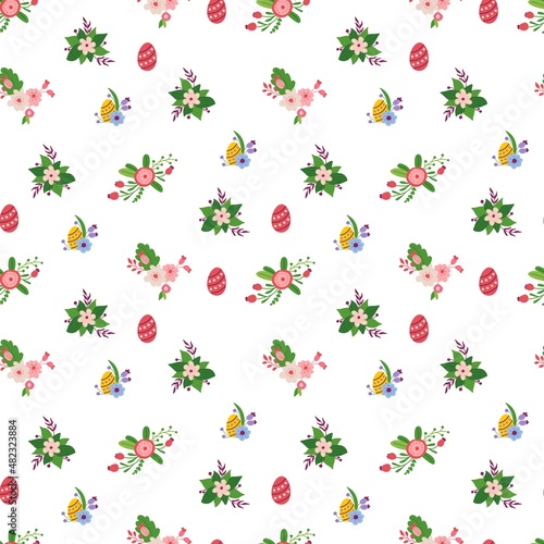 Spring Seamless pattern with hand drawn flowers and easter eggs. Design for fabric, textile, wallpaper, packaging.
