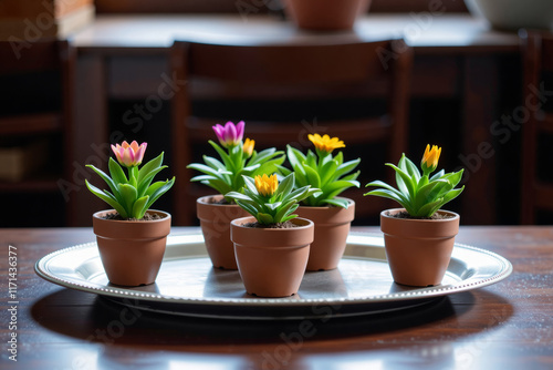 Spring Seedlings in Small Terracotta Pots on a Tray