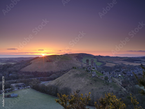Spring sunrise over Corfe Castle, Purbeck, Dorset, UK